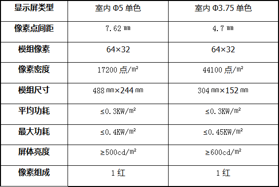室内单色LED显示屏【技术参数】: